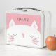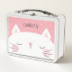 Boîte à lunch en métal rose et blanc avec un chat blanc au nez rose et de mignonnes taches roses contre un arrière - plan rose aux points blancs. Ajoutez le nom de votre enfant !