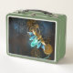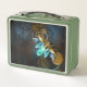 Luciole à vapeur avec ailes bleues transparentes et ampoule verte sur arrière - plan usé, marron, texturé. Style Steampunk.