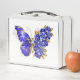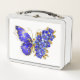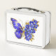 Bijoux, bleu, saphir, papillon aux fleurs pétillantes avec aile décorée de bleu, fleurs précieuses avec feuilles d'or sur arrière - plan blanc.