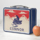 Créez un cadeau personnalisé pour votre motoneige préférée. Cette couverture lunchbox présente une illustration de style vintage d'une motoneige et d'un coureur en bleu marine sur fond de montagnes couleur crème ou ivoire contre un arrière - plan rouge. Il est prêt à être personnalisé avec un nom en lettres bleu marine.