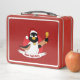 Lunch box with an illustration of cute little royal penguin holding a scepter and wearing a red Santa hat; Christmas holiday cartoon design for kids
