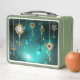 Or, clés antiques avec engrenages et cadrans accrochés sur chaînes dorées sur arrière - plan vert lumineux.