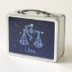 Boîte à lunch avec le symbole de Libra en bleu argenté doux, recouverte d'étoiles de la constellation, contre un arrière - plan étoilé du bleu nuit profond au noir.
