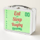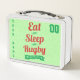 Étanche À Déjeuner En Métal De Rugby. Ajoutez votre propre nom et numéro à la boîte à lunch pour faire une grande boîte personnalisée, pour l'école, l'université, le bureau ou les voyages! Il suffit d'utiliser les zones de texte situées à droite de l'image. Grande conception de texte en rouge et vert avec le texte EAT SLEEP RUGBY REPEAT, et un motif de balle de rugby.