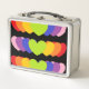 Que vous l'utilisiez pour apporter votre déjeuner ou fourre-tout votre rouge à lèvres, vous adorerez cette lunchbox en métal de style rétro avec des oeuvres de Buttercup's Clothing and Collectables ! Cette boîte à lunch super mignonne présente un motif de coeur abstrait dans plusieurs tons de l'arc-en-ciel, sur fond noir. Diverses couleurs arrière - plans disponibles.