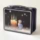 Une lunchbox en métal noir avec des dessins de dragons heureux qui admirent des bougies, par Melody Pena.