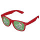 Ces lunettes de fête rétro ont un drôle de squelette de Noël portant un chapeau de Père Noël rouge tenant des ornements ronds à chaque oeil sur un arrière - plan vert.