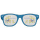 Ces lunettes de fête rétro ont de mignons petits oiseaux rouges et bleus assis sur des branches avec des fleurs jaune vif sur un arrière - plan blanc. Customisez votre texte avec le modèle.