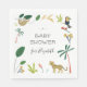 Whimsical baby shower design featuring lush jungle plant life and animal illustrations including a tiger, parrot, sloth, monkey and snake.