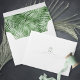 A trendy colour palette in shades from soft tea and moss to dark hunter green; sparkling geometric frames and elegant design layouts, provide the basis for this exciting wedding suite. Whether you're planning a destination wedding or staying close to home, this delicate palm leaf design set makes an eye-catching choice. A patterned interior stands out against the snow white exterior of this elegant envelope. Easily add your initials and address using the provided template. Search ID956 to see other pieces and colour choices for this set.