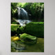 A large forest waterfall complete with mossy rocks and lush forest. This is the beautiful Charlie Falls, a little-known waterfall in the temperate rainforest of North Carolina's Appalachian Mountains