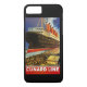 Vintage Cunard Line ocean liner poster showing a stern view of the four-stack RMS Lusitania embarking from the pier.