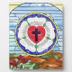 The Luther Rose's symbolism dates back to the 1520s. Luther explained that the red heart with the black cross represents the righteous living by faith in Christ the Crucified. The heart rests on a white rose, symbolizing joy, comfort, and peace found through faith. The choice of white reflects the colour of heavenly spirits and angels. The white rose is set against a blue field, representing heaven, to signify that earthly joy and faith are just the beginning of eternal heavenly joy. Surrounding the blue field is a gold ring, symbolizing the endless and precious happiness of heaven.