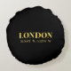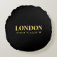 Lux round accent pillow design features London, England latitude and longitude map coordinates in gold fonts.