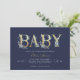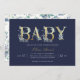 Affordable custom printed baby shower invitations personalized with your party details. This elegant design features faux gold foil typography with delicate watercolor florals on a bold navy blue background. Use the design tools to customize the text, edit the fonts and colours or add your own photos to create a classy and stylish girl baby shower invitation.