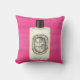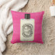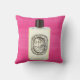 This pillow features an original painting by artist Anne Harwell of a classic French perfume bottle with black cap on a raspberry coloured background. Design is on both front and back.