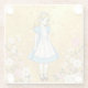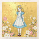 This is a pretty gold Luxe Alice In Wonderland Coaster. The image features Alice in the centre wearing a blue and white pinafore. There are flowers on both sides and the background is luxe gold. The coaster is a square glass coaster. The coaster is dishwasher safe. The design was created with generative art.