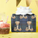 This blue tartan gift wrap features a cute preppy bear holding a gift on a plaid background.