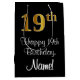 This stylish, sophisticated, and luxurious birthday giftbag design features a large ordinal number “19th” having an imitation/faux gold-like appearance, in addition to the birthday greeting message “Happy 19th Birthday,” and an editable recipient name in a script-style font. It also has a black-coloured background. A stylish birthday themed gift bag like this might be a fun way to wrap a gift or present being given to celebrate somebody’s 19th birthday. [~Z0000514]