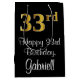 This elegant, luxurious, and stylish birthday-themed gift bag design features a large ordinal number “33rd” having an imitation/faux gold-inspired look, in addition to the birthday greeting message “Happy 33rd Birthday,” and a custom recipient name in a script-style font. It also has a black-coloured background. A gift bag like this might be used when wrapping gifts being given to somebody in celebration of their thirty third birthday. [~Z0000514]