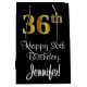 This luxurious, elegant, and sophisticated birthday themed gift bag design features a large ordinal number “36th” having an imitation/faux gold-inspired appearance, plus the birthday greeting message “Happy 36th Birthday,” and a personalized recipient name in a script-style font. The background is coloured black. A birthday themed gift-bag like this might be a fun way to wrap a gift or present being given to celebrate somebody’s thirty sixth birthday. [~Z0000514]