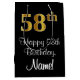 This elegant, stylish, and sophisticated birthday-themed giftbag design features a large ordinal number “58th” having a faux/imitation gold-like look, along with the birthday greeting message “Happy 58th Birthday,” and a customizable recipient name in a script-style font. The background is coloured black. A birthday themed gift bag like this might be a fun way to wrap a gift or present being given to somebody who is celebrating their fifty eighth birthday. [~Z0000514]