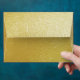 A luxurious envelope in an elegant gold foil effect with a black inside sprinkled with gold glitter confetti. This is part of an elegant matching wedding suite that can be fully personalized.