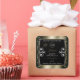 Matching a shimmery platinum coloured frame and cute hearts graphic on a black background.