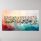 The script boasts a metallic, multi-colored finish that stands out against a stunning, abstract background of swirling oil-paint textures. This premium artwork is an ideal choice for modern Muslim homes, prayer rooms, or as a thoughtful gift for Ramadan, Eid, or weddings.