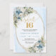 Celebrate a milestone moment with this elegant Sweet Sixteen invitation, featuring a refined watercolor design of dusty blue florals blended with soft white flowers and fresh eucalyptus greenery. Framed by a shimmering gold glitter border and paired with graceful script lettering, this invitation sets a sophisticated tone for a truly unforgettable Sweet Sixteen, Sweet 16th, or 16th birthday celebration.