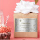 Make a lasting impression with this elegant and modern product label design featuring pretty squiggled gold ornate corners with cute hearts on a luxury shimmery silver coloured background.