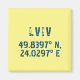 Modern magnet design features latitude and longitude coordinates for Lviv, Ukraine in distressed dark blue font on yellow background