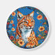 Lynx with vibrant orange fur that showcases distinct spots. The lynx has striking bright amber eyes and prominent tufts of fur on its ears. It is surrounded by a lively display of colourful flowers, including shades of blue, yellow, and red, set against a bold blue background. The overall composition blends natural elements with an artistic flair, highlighting both the beauty of the lynx and the floral arrangement. This creates a visually stunning and harmonious scene.