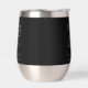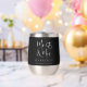 Tumbler thermique noir personnalisé pour célébrer votre mariage et anniversaire avec "Mr & Mrs" écrit dans un grand élégant script blanc et une illustration blanche de deux anneaux mariages réunis. Ajoutez votre nom et votre date de mariage dans une simple et élégante typographie blanche.