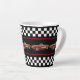 Voici une tasse en latte élégante qui étoile une corvette vintage rouge. Placé sur un arrière - plan noir, ce design a une bordure à damiers noir et blanc sur le dessus et le bas, de la tasse. Au centre, il y a une rangée de la même image de Corvette.