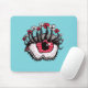 Weird eye mousepad with a digital illustration depicting a creepy red eye with eyelashes which have their own eyelashes and are ending in flowers red and grey flowers over cheerful blue background. When sometimes your eyes are so strained that you are sure they will melt in the next three seconds. This psychedelic design is just for you if you like bright colors and weird art.