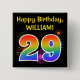 Ce design amusant et dynamique de boutons comporte un motif coloré et inspiré par des feux d'artifice festifs, ainsi que le numéro "29" avec un spectre multicolore inspiré de l'arc-en-ciel ou motif dégradé. Il comporte également un nom et un message d'événement personnalisables, comme un message d'anniversaire "Joyeux anniversaire". Un bouton comme celui-ci peut être porté par les invités à une fête d’anniversaire qui se tient pour célébrer le vingt-neuvième anniversaire de quelqu’un. [~Z0000334]