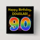 Ce design amusant et dynamique de boutons propose un motif coloré et inspiré par des feux d'artifice festifs, ainsi que le numéro "90" avec un arc-en-ciel multicolore comme le spectre ou le motif dégradé. Il comporte également un nom personnalisé et un message d'événement, comme un message d'anniversaire "Joyeux anniversaire". Un bouton comme celui-ci peut être porté par les participants à une fête d’anniversaire organisée pour célébrer le quatre-vingt-dixième anniversaire de quelqu’un. [~Z0000334]