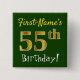 This simple square button design fea message like "First-Name’s 55th Birthday!", with the "55th" having a faux/imitation gold-like coloring look, on a green colored background. The name can be customized. Buttons like these could perhaps be worn by guests at birthday for somebody who who’s celebrating their fifty fifth birthday, where the party is being héroïin a large area with of other people present (such a city park or a theme park). 2.