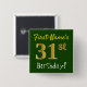 Ce simple design de bouton carré comporte un message comme "31e anniversaire de prénom!", avec le "31e" ayant un faux/imitation de couleur dorée, sur un arrière - plan vert. Le nom peut être personnalisé. Des boutons comme ceux-ci pourraient être portés par les invités à une fête d'anniversaire pour quelqu'un qui célèbre son trente et unième anniversaire, où la fête se déroule dans un grand espace avec beaucoup d'autres personnes présentes (comme un parc municipal ou un parc à thème). [~Z0000163]