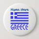 Touche de bouton personnalisée avec le drapeau grec et le mot, GRÈCE, en bleu ci-dessous. Le drapeau présente des rayures bleues et blanches avec une croix bleue et blanche en haut à droite. Au-dessus, ajoutez un nom pour une touche personnalisée à un cadeau de rembourrage. Amusant à porter lors de réunions de famille.