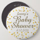 Ce joli badge de baby shower neutre pour les hommes et les femmes, saupoudré ou couple, comporte des coeurs d'amour dorés et de magnifiques calligraphies de scénario en faux or. Customisez avec votre nom et votre date. Conçu par Pure Piglet© à l'adresse www.zazzle.com/purepiglet*.