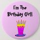 Un bouton de lecture I Am The Birthday Girl en lettres amusantes avec un gâteau d'anniversaire géant avec gigantesque givre rose et jaune, givrage goutte à goutte et bougies bleues brillantes.