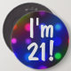 Une goupille colorée de fête de bouton avec un bokeh d'arrière - plan des lumières colorées de partie et du texte indique : "J'ai 21 ans !" Facile à customiser cet insigne mignon et à le personnaliser avec tout âge ou nom, etc. Une goupille heureuse et d'amusement de bouton pour tout âge !