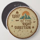 Embrace the spirit of exploration with this vintage-style “Lost in the Right Direction” design. Featuring a retro circular badge with mountains, a rising sun, compass needle, sailboats, airplanes, and dotted adventure paths, this artwork captures the joy of wandering and discovering new places.