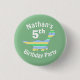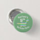 Le dinosaure rayé vert et bleu de bande dessinée sur l'âge personnalisé de l'anniversaire de l'enfant mignon se boutonne.