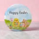 Bright spring colors and playful charm shine on this watercolor Easter button, featuring a fluffy baby chick carrying a basket of colorful Easter eggs while a friendly bunny in a pink bowtie keeps watch nearby. Surrounded by blooming pastel tulips, the cheerful design captures the joyful spirit of the season, adding a fun and festive touch to Easter outfits, party favors, and spring celebrations.