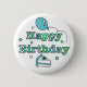 Bouton d'anniversaire joyeux, bleu et vert joyeux, dessiné à la main, avec ballon et gâteau d'anniversaire.