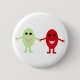 Bouton rond blanc avec un joli dessin d'un raisin rouge souriant tenant les mains avec un raisin vert souriant, les deux raisins ont des yeux noirs brillants et des bouches roses.