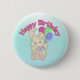 Le bouton de lapin de joyeux anniversaire, partagent ce bouton adorable de lapin avec un ami ou un membre de la famille sur leur anniversaire. Ce lapin très coloré est brun clair, a les ballons de transport de sourire d'un visage, indique le joyeux anniversaire dans le point culminant mauve, jaune et rose, ensemble sur un arrière - plan de turquoise.